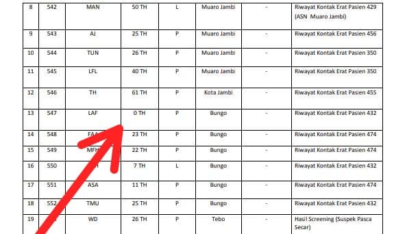 Sebagaimana diumumkan Tim Gugus Tugas Percepatan Penanganan Covid-19 Provinsi Jambi, dari daftar hasil pemeriksaan swab test konfirmasi pada kolom ke 13 atau pasien nomor urut 574 yaitu LAF usia 0 tahun Perempuan asal Kabupaten Bungo.