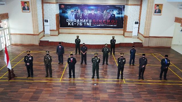 JAMBERIT.A.COM- Danrem 042/Garuda Putih Brigjen TNI M. Zulkifli, S.I.P, M.M,. mengikuti rangkaian acara HUT ke 75 TNI secara virtual dari Balai Prajurit Korem 042/Gapu, Jambi.
