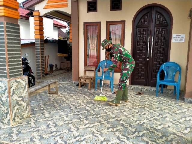Seperti yang dilakukan Serda Fernando, ia membantu orang tua asuh menyapu teras sebelum berangkat menuju tempat bekerja ke lokasi pekerjaan fisik kegiatan TMMD.