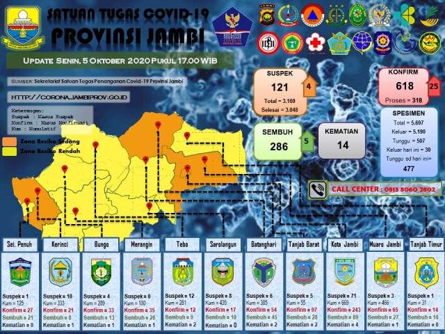 Hingga saat ini total keseluruhan kasus positif Covid-19 di Provinsi Jambi sebanyak 618 kasus, 14 meninggal dunia, 286 sembuh dan 318 sedang dalam perawatan di rumah sakit. (sap)