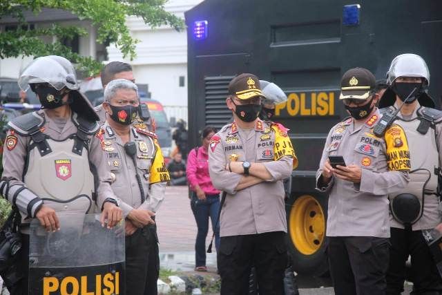 JAMBERITA.COM- Kapolda Jambi, Irjen Polisi Firman Santyabudi memimpin pengamanan aksi unjuk rasa sejumlah element Mahasiswa dalam rangka 1 Tahun Presiden Jokowi sekaligus Menolak UU Omnibus Law di Kantor DPRD Provinsi Jambi, Selasa (20/10/2020).