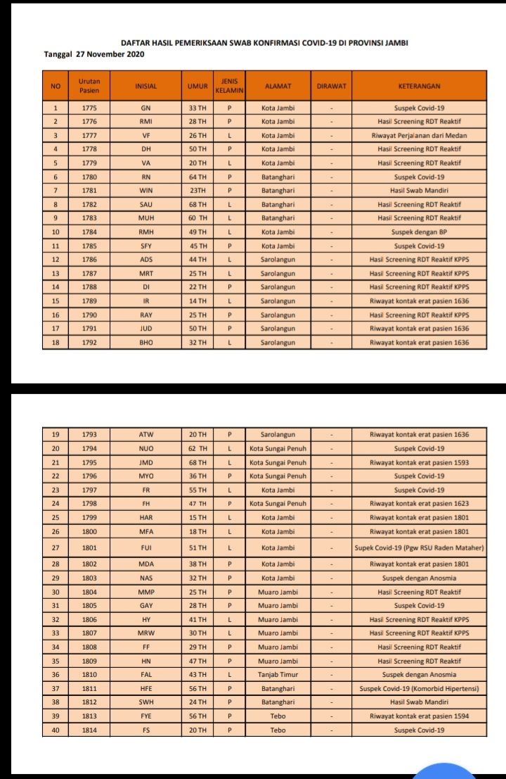 Adapun secara rinci 46 orang postif hari ini berasal dari Kota Jambi 13 orang. Kemudian, asal Sarolangun 8 orang. Lalu Tebo, Muaro Jambi dan Batanghari masing-masing bertambah 6 orang.