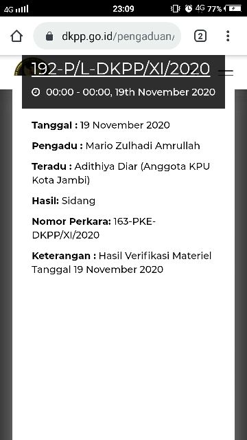 Dalam laman tersebut dijelaskan bahwa Adithiya Diar selaku teradu dilaporkan oleh Mario Zulhadi Amrullah. Pengadu sendiri saat ini aktif sebagai Panwascam Jambi Selatan.