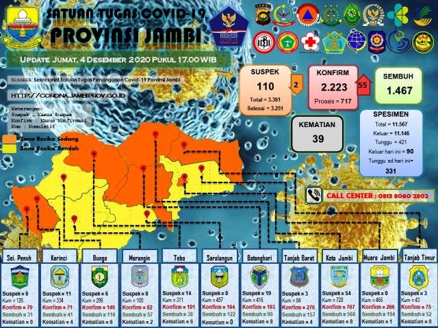 Johansyah mengatakan bahwa saat ini total keseluruhan kasus Covid-19 di provinsi Jambi sebanyak 2223 kasus, pasien meninggal dunia 39 orang, sembuh 1467 pawien dan sedang dalam perawatan sebanyak 717 pasien.