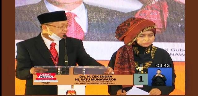 JAMBERITA.COM - Dalam debat, Calon Gubernur Jambi nomor urut satu Cek Endra paparkan visi misi. Cek Endra menjelaskan bahwa untuk penanganan, pencegahan dan pengendalian Covid-19 dirinya akan fokus kepada peningkatan kesejahteraan masyarakat Jambi.