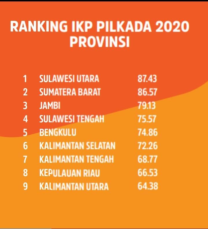 Peringkat kerawanan pilkada secara umum pada provinsi yang menyelenggarakan pemilihan gubernur adalah Sulawesi Utara (87,43); Sumatera Barat (86,57); Jambi (79,13); Sulawesi Tengah (75,57); Bengkulu (74,86); Kalimantan Selatan (72,26); Kalimantan Tengah (68,77); Kepulauan Riau (66,53); dan Kalimantan Utara (64,38).