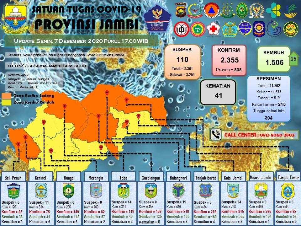 Total keseluruhan kasus covid-19 di provinsi Jambi sebanyak 2355 orang dengan jumlah pasien dalam perawatan sebanyak 808 orang dan pasien meninggal dunia 41 orang.