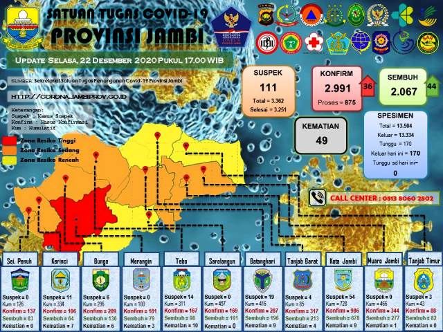 JAMBERITA.COM - Kasus Covid-19 di Provinsi Jambi bertambah sebanyak 36 orang hari ini Selasa 22 Desember 2020.