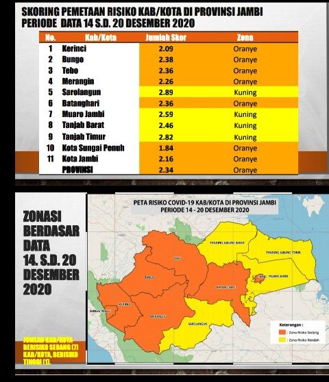 "Kabupaten Kerinci, Bungo, Tebo, Merangin, Batanghari, Kota Sungai Penuh, Kota Jambi masuk zona oranye atau zona resiko sedang. Untuk kabupaten Sarolangun, Muaro Jambi, Tanjung Jabung Barat dan Tanjung Jabung Timur masuk zona kuning atau zona resiko rendah penyebaran Covid-19," jelas Johansyah.