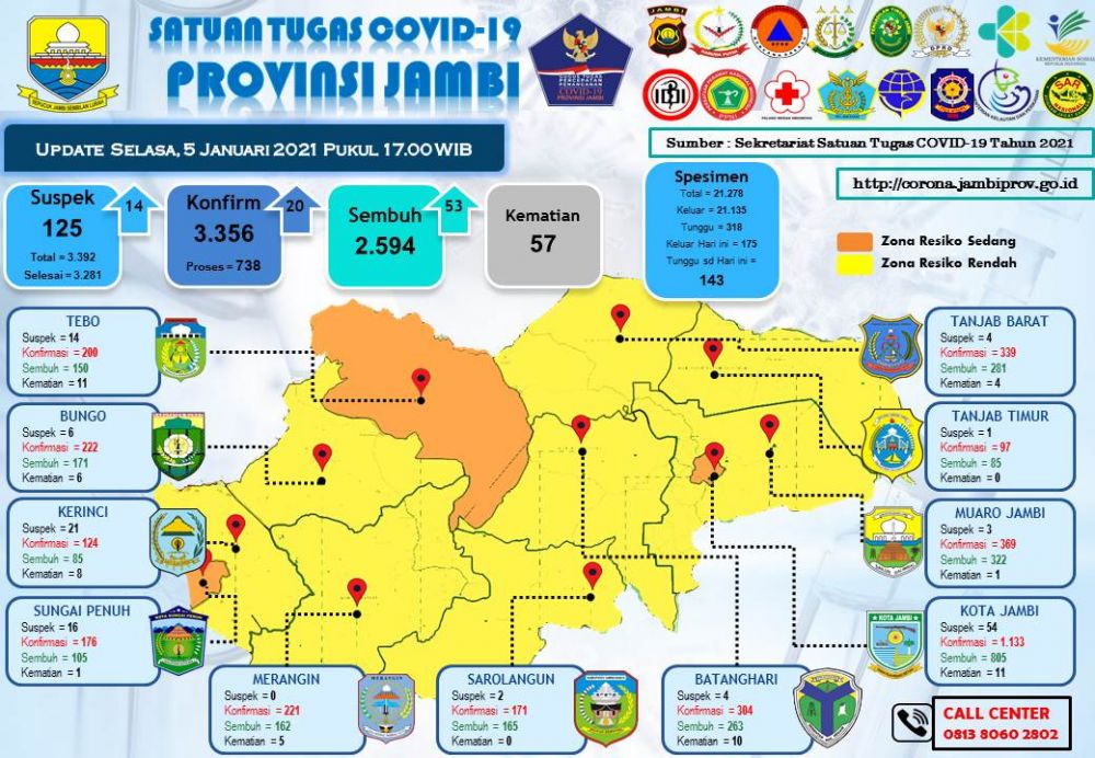 Sehingga total keseluruhan kasus Covid-19 provinsi Jambi sebanyak 3356 orang, sembuh bertambah 53 pasien menjadi 2.594 orang, meninggal dunia bertambah 57 orang dan pasien dalam perawatan 738 orang.