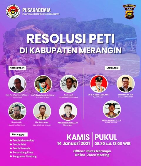 Kegiatan FGD ini dilaksanakan di Aula Polres Merangin pada Kamis, (14/1/2021) bertujuan untuk mengurai dan merumuskan solusi terbaik terhadap persoalan Penambangan Emas Tanpa Izin (PETI) di wilayah hukum Polres Merangin. Kegiatan ini dilaksanakan secara luring dan daring melalui apilkasi zoom.