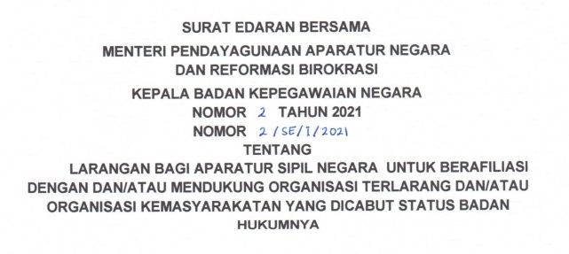 Penerbitan SE Bersama No. 02/2021 dan No. 2/SE/I/2021 yang ditandatangani pada 25 Januari 2021 ini dimaksudkan sebagai pedoman dan panduan bagi Pejabat Pembina Kepegawaian (PPK) mengenai larangan, pencegahan, serta tindakan terhadap ASN yang berafiliasi/mendukung organisasi terlarang atau ormas tanpa dasar hukum. Dalam SE tersebut terdapat ketentuan mengenai langkah-langkah pelarangan, pencegahan, penindakan, serta dasar hukum penjatuhan hukuman disiplin bagi ASN yang terlibat.