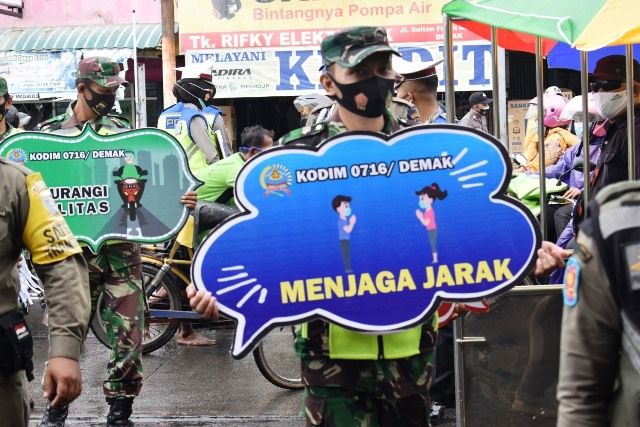 JAMBERITA.COM, DEMAK - Anggota TNI dari Kodim 0716/Demak bersama dengan Kepolisian dan Satpol PP di wilayah Kabupaten Demak terus berupaya melakukan aksi gabungan dalam upaya menekan penyebaran Covid-19 di Wilayah Teritorialnya dengan melakukan patroli rutin untuk menertibkan atau mendisiplinkan penggunaan masker di kalangan para pedagang maupun pengunjung, khususnya di kawasan Pasar Tradisional Bintoro, Kabupaten Demak, Rabu (03/02/21).
