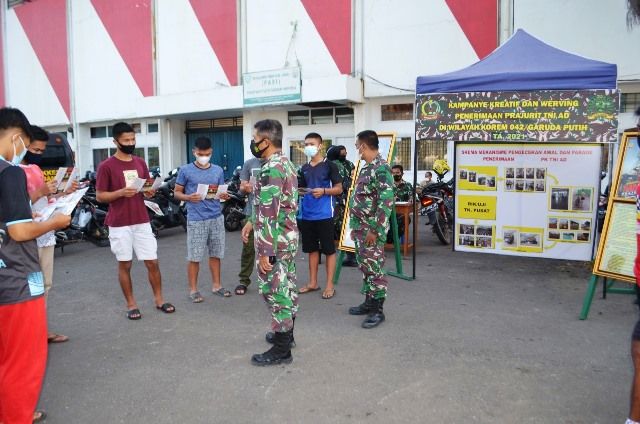 JAMBERITA.COM-Guna menarik minat pemuda pemudi yang ingin bergabung di institusi TNI, Ajenrem 042/Gapu gelar Kampanye Kreatif dan Werving Prajurit TNI di Halaman Stadion Tri Lomba Juang ( KONI) Kota Jambi. Jum'at, 5/2/2021.