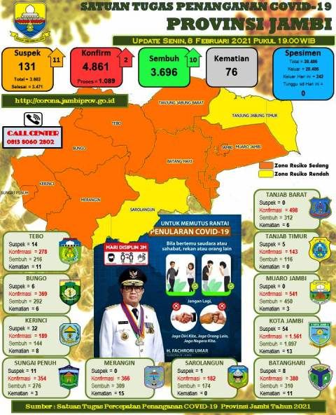 JAMBERITA.COM - Kasus terkonfirmasi positif Covid-19 di provinsi Jambi kembali bertambah. Tim gugus tugas penanganan Covid-19 Provinsi Jambi mengumumkan 2 orang yang terpapar Covid-19. Senin, (8/2/2021).