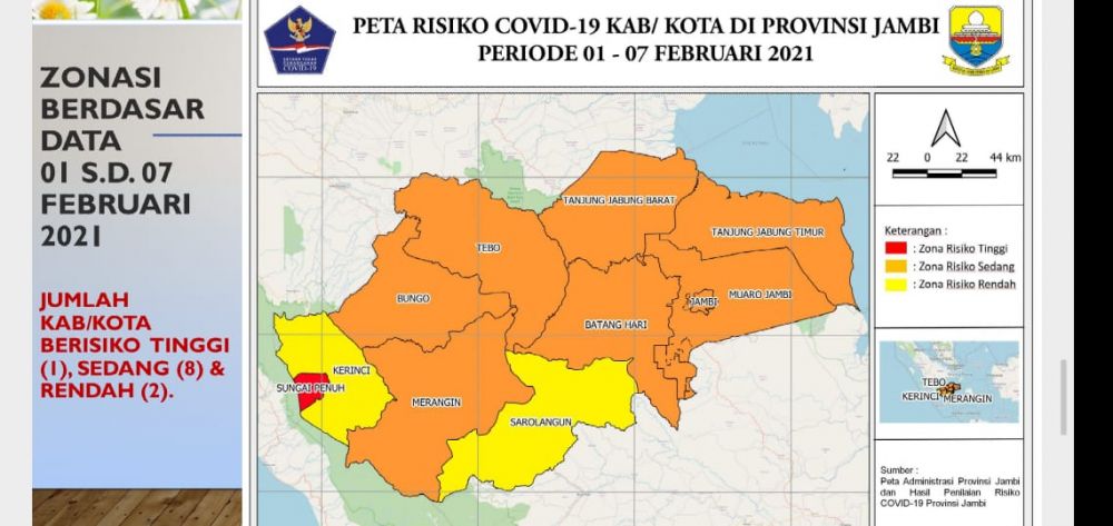 Untuk diketahui, yang masuk kedalam zona merah yaitu Kota Sungai Penuh, zona orange yaitu kabupaten Bungo, Tebo, Merangin, Batanghari, Tanjung Jabung Barat, Tanjung Jabung Timur, Muaro Jambi dan Kota Jambi. Dan zona kuning yaitu wilayah kabupaten Kerinci dan Sarolangun.