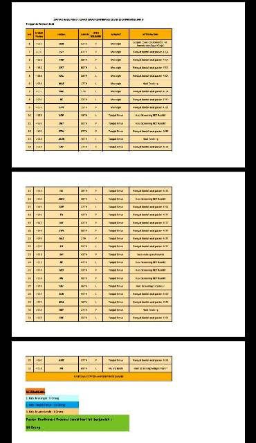 Inisial MAS 17 tahun laki-laki Merangin hasil tracking. RAP 5 tahun laki laki Merangin riwayat kontak erat pasien 4634. BS 32 tahun laki-laki Merangin riwayat kontak erat pasien 4380. EFN 35 tahun perempuan Merangin riwayat kontak erat pasien 4381. SOP 43 tahun laki-laki Tanjab Timur hasil screening RDT reaktif.