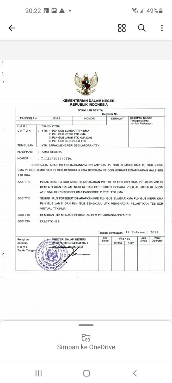 "Kita baru mendapat info lisan, bahwa mempersiapkan pelantikan secara virtual pelantikan Pj Jambi," katanya, Rabu (17/2/2021).