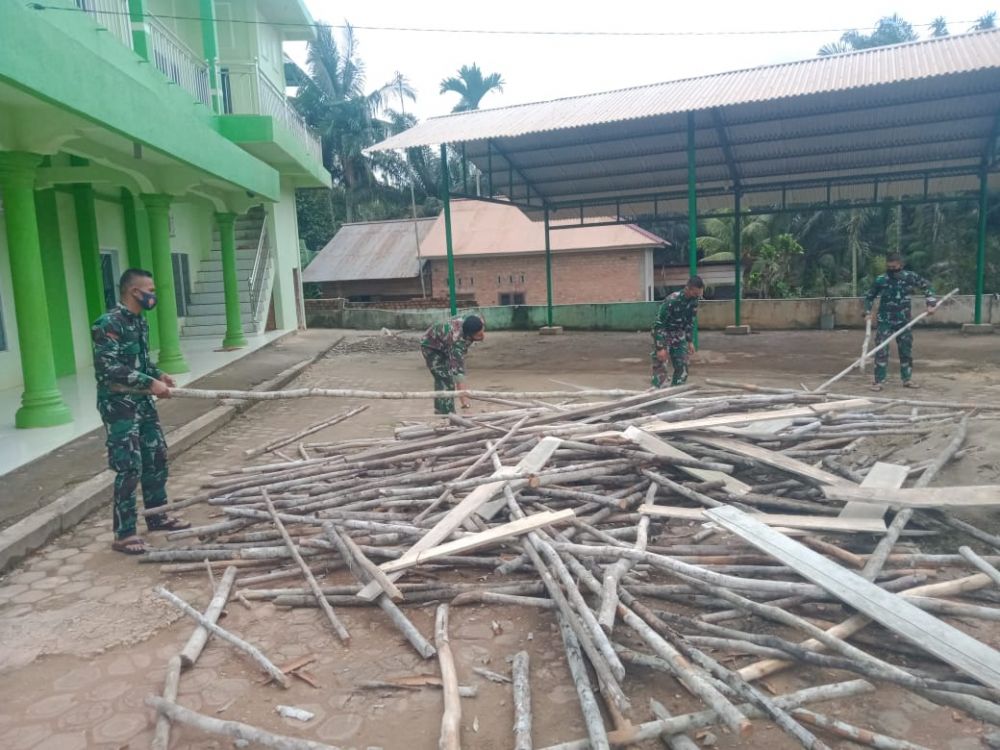 Satgas TMMD 110 Kodim 0415/BTH Rapikan Tumpukan Kayu di Area Masjid Raudhatul Hasanah