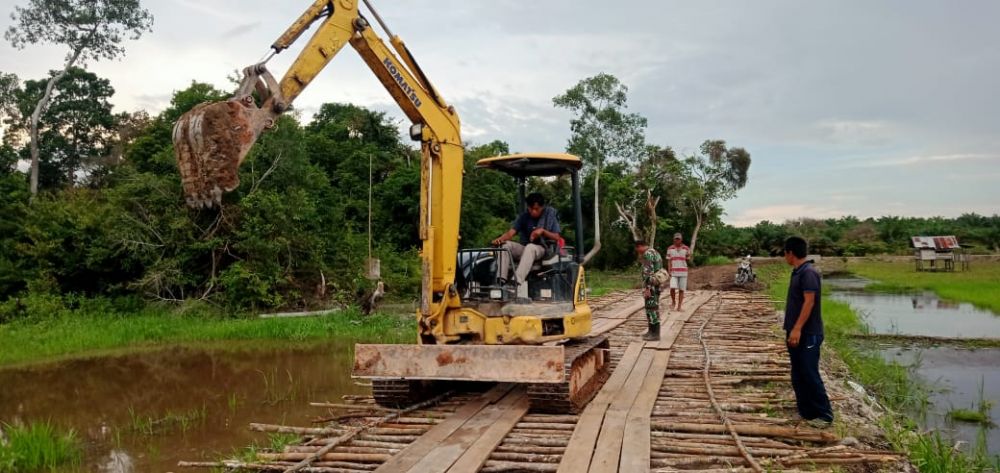 JAMBERITA.COM- Usai pembuatan jembatan, Dan SSK TMMD ke 110 Kodim 0415/Batanghari di Desa Sungaiterap, Kapten Inf Rilman, mengetes kekuatan dan ketahanan jembatan dengan menggunakan excavator, Minggu (28/3/2021).