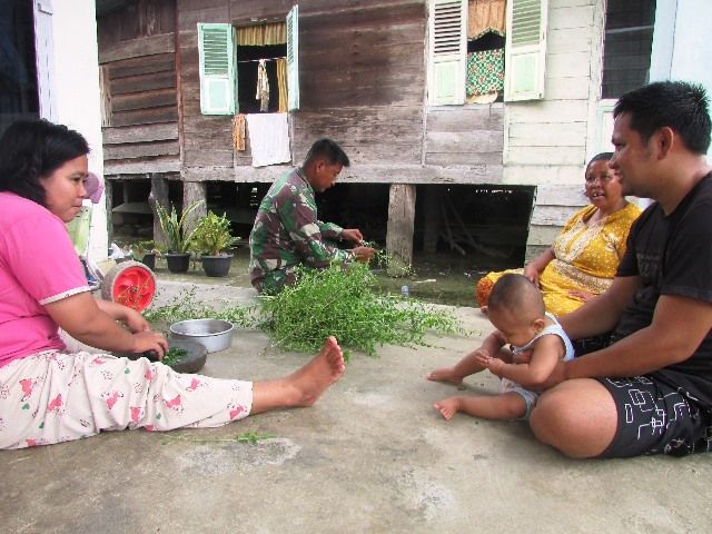 JAMBERITA.COM- Di sela waktu senggang, Satgas TMMD ke 110 Kodim 0415/Batanghari bantu warga Desa Sungaiterai membuat inai yang berasal dari daun henna atau pacar, Selasa (30/3/2021).