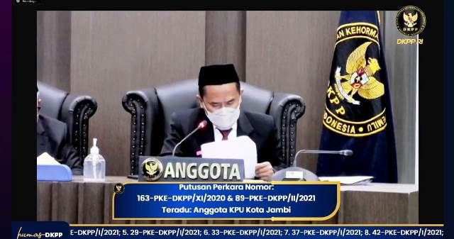 JAMBERITA.COM - Dewan Kehormatan Penyelenggara Pemilu (DKPP) Republik Indonesia memutuskan pemberhentian tetap kepada Anggota KPU Kota Jambi. Hal ini diketahui dari sidang putusan yang disiarkan langsung lewat situs resmi DKPP RI.