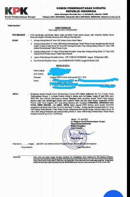 Surat pemanggilan empat orang tersebut beredar. Mereka dipanggil untuk diperiksa sebagai tersangka dugaan korupsi menerima hadiah atau janji terkait pengesahan RAPBD Provinsi Jambi tahun anggaran 2017-2018.