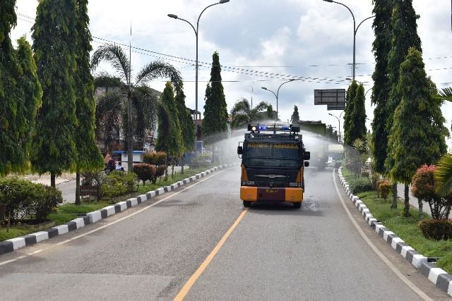 Penyemprotan itu mencegah antisipasi penyebaran virus covid 19 pasca lebaran mengunakan mobil AWC milik polres Merangin.