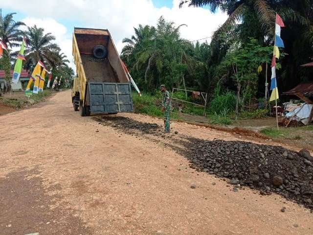Terlihat Kapten Inf Suhari Danramil 420-07/Sungai Manau yang juga sebagai koordinator peningkatan jalan, sedang mengawasi dropping bahan material. Rabu (30/06/21).
