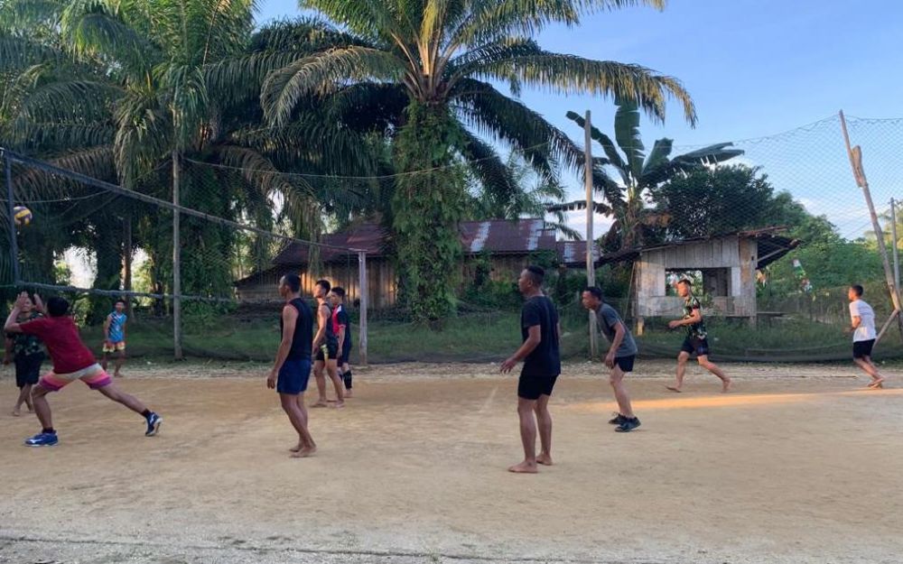 Bersama dengan warga setempat, anggota satgas melaksanakan olah raga bersama dengan bermain voly di Dusun 4 Bukit Beringin.