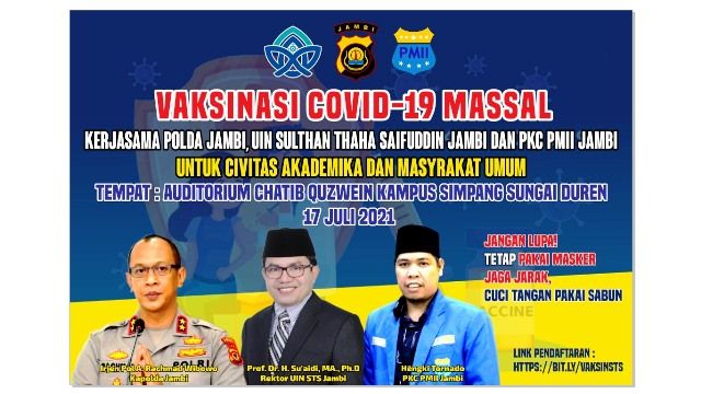 JAMBERITA.COM - Universitas Islam Negeri (UIN) Sulthan Thaha Saifuddin Jambi akan melaksanakan vaksinasi Covid-19, Sabtu (16/7/2021). Vaksinasi ini hasil kerjasama dengan Polda Jambi dan PKC PMII Provinsi Jambi.