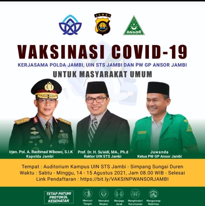 JAMBERITA.COM - Universitas Islam Negeri (UIN) Sulthan Thaha Saifuddin Jambi akan melaksanakan vaksinasi Covid-19 tahap II pada 14 - 15 Agustus. Vaksinasi ini hasil kerjasama dengan Polda Jambi dan PW Gerakan Pemuda (GP) Ansor Provinsi Jambi.