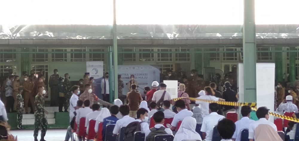 JAMBERITA.COM - Menteri Pendidikan dan Kebudayaan (Mendikbud) RI Nadiem Makarim melakukan peninjauan serbuan vaksinasi massal di Aula Makorem 042/Gapu, Selasa (21/9/2021).