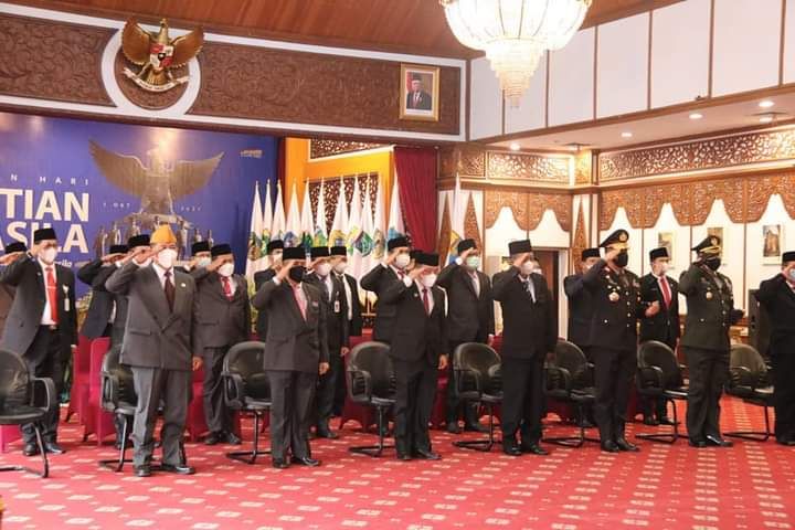 JAMBERITA.COM - Gubernur dan Wakil Gubernur Jambi Al Haris-Abdullah Sani mengikuti Upacara Peringatan Hari Kesaktian Pancasila di Monumen Pancasila Sakti, Lubang Buaya Jakarta secara virtual , dari Rumah Dinas Gubernur Jambi, Jumat (1/10/21).