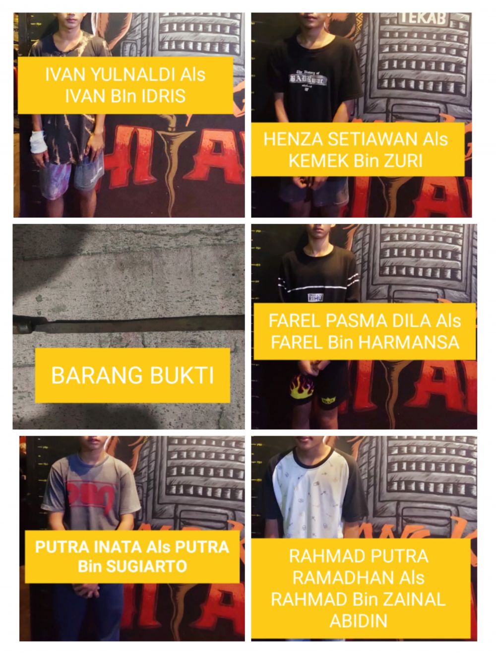 Mereka diamankan beserta barang bukti yakni Sajam dengan panjang sekira 70 CM, satu unit motor Yamaha Jupiter Warna Hijau dan satu unit motor Honda Beat Warna Putih."Pelaku terdapat peran masing-masing, ada yang membawa kendaraan mendampingi teman-temannya. Untuk yang membacok pelaku berinisial HS," jelasnya.