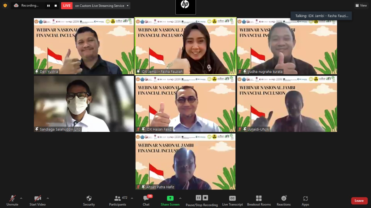Selanjutnya apresiasi sekali acara Jambi Financial Inklusion Festival 2021 ini, ini merupakan acara webinar nasional yang diselenggarakan dalam rangka memperingati bulan inklusi keuangan. Saya mengucapkan terima kasih yang sebesar besarnya kepada Kspm Unja dan Himaekis yang telah mengajak kami untuk berkolabosari bersama, suatu kebanggan bagi kami kspm uin jambi dapat menjadi bagian dari acara jfi fest 2021 ini, ini merupakan pertama kalinya kspm uin berkolaborasi bersama 3 lembaga mahasiswa lintas kampus untuk mengadakan webinar tingkat nasional., tutur ketua KSPM UIN Jambi NurRokhim.