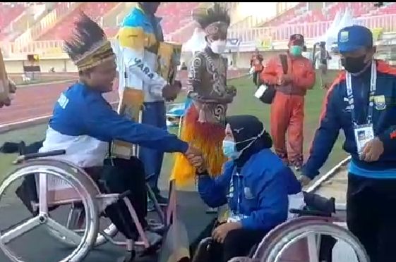 JAMBERITA.COM - Momen mengharukan saat pengalungan medali emas kepada Abdul Hamid atlet asal Kabupaten Batanghari di laga Pekan Paralimpik Nasional (Peparnas) XVI Papua.
