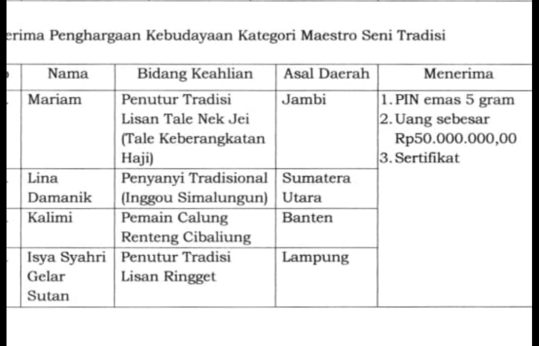 Di penghujung tahun 2021 Tale Naik Joi, menerima penghargaan kebudayaan dengan penutur Etek Mariam, telah di tetapkan sebagai penerima pin emas, dan maestro seni tradisi oleh Dirjen Kebudayaan, Kementerian Pendidikan, Kebudayaan, Riset, dan Tekhnologi, dan Provinsi Jambi juga menerima sertifikat WBTB (Warisan Budaya Tak Benda), prestasi ini tak lepas dari usaha banyak orang yang masih punya peduli dan semangat untuk membanggun kebudayaannya, penulis mengikuti betul kisah perjalanan dari awalnya, dari diskusi diskusi kecil, hingga ia menjadi wujud, kita tak bisa mengeyampingkan peranan peranan individu dalam hal ini, diantaranya PLT Kadis Disbudpar Provinsi Jambi, Sri Purnama Syam dengan timnya, Nukman yang menulis thesisnya tentang tale naik Joi, budayawan Jaffar Rassu, M. Ali Surakhman, dan banyak orang yang tak bisa kita sebut satu persatu.