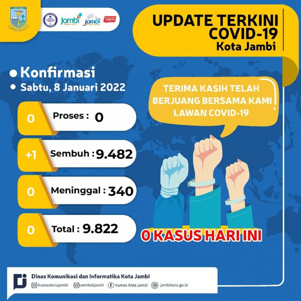 JAMBERITA.COM - Update data perkembangan kondisi Covid-19 Kota Jambi. Jumlah kasus terkonfirmasi positif Covid-19 di Kota Jambi hari ini Sabtu (8/1/2022) nol pasien.