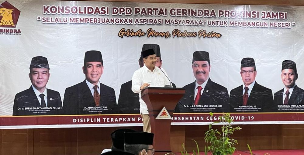 JAMBERITA.COM- Visi kepemimpinan yang kuat dari Ketua DPD Partai Gerindra Provinsi Jambi Dr. Ir. H. A.R. Sutan Adil Hendra, MM tergambar dari kegiatan konsolidasi partai berlambang burung Garuda tersebut di Hotel Grand Jalan Patimura (18/1/22) kemarin.