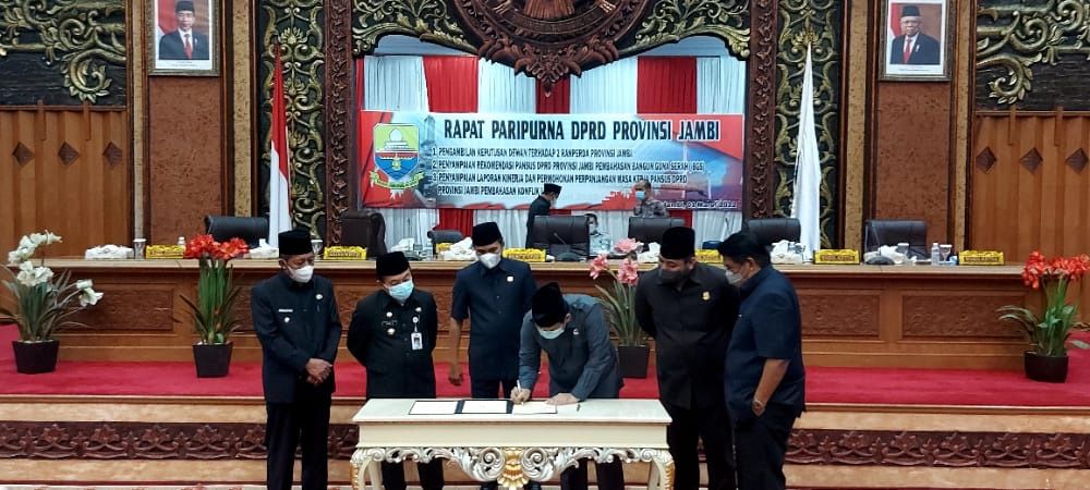 JAMBERITA.COM - DPRD Provinsi Jambi menggelar sidang paripurna pengambilan keputusan terhadap dua Ranperda Provinsi Jambi di ruang paripurna DPRD Provinsi Jambi, Selasa (1/3/2022) malam.