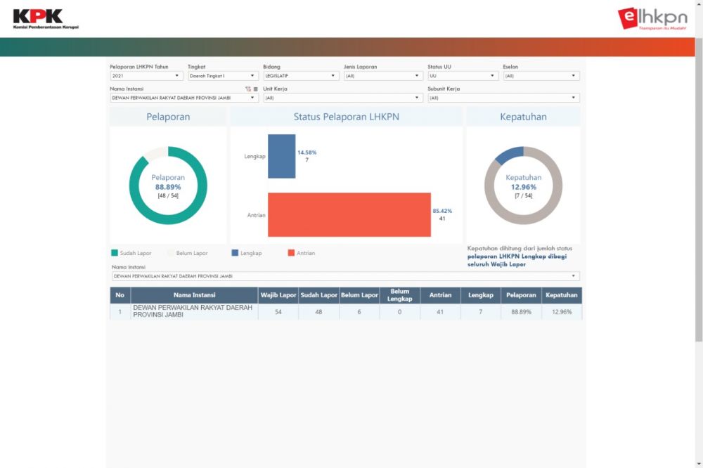 Penelusuran jamberita.com , dari 54 orang di DPRD, ada 6 wajib lapor yang belum melapor LHKPN per 31 Maret 2022 sehingga tingkat kepatuhan berada di angka 12.96 persen.