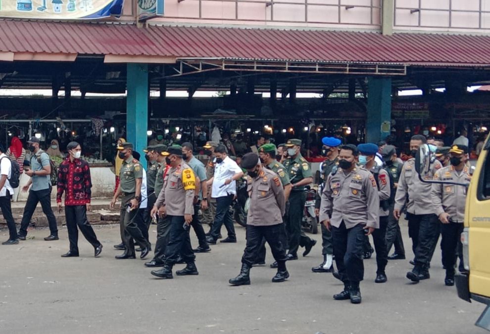 Pantauan di lokasi, terlihat ratusan petugas kepolisian TNI dan Polri yang menggunakan senjata lengkap, serta Paspampres menyisir area pasar dan melaksanakan apel di Pasar Angso Duo Baru Jambi.