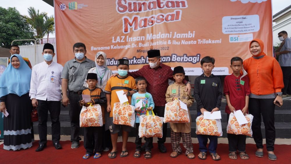 JAMBERITA.COM- Minggu (26/6) LAZ Insan Madani Jambi bersama dengan Keluarga Bapak dr.Budi Justitia SpOT dan Ibu Nasta Trilaksmi mengadakan sunatan massal bekerjasama dengan Himpunan Perawat Gawat Darurat dan Bencana Indonesia (HIPGABI).