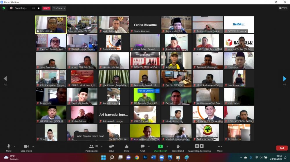 JAMBERITA.COM - Bawaslu Provinsi Jambi menggelar kegiatan webinar 600 Hari Menuju Pemilu 2024: Mengidentifikasi Pelanggaran, Mengoptimalkan Pencegahan yang Berlangsung Secara Daring Jumat, 24 Juni 2022. Dengan menghadirkan pembicara Anggota Bawaslu RI Loly Suhenty, Tenaga Ahli Bawaslu RI, Dahliah Umar Ketua Netfid Indonesia, dan Wein Arifin Ketua Bawaslu Provinsi Jambi yang dipandu oleh Fahrul Rozi Anggota Bawaslu Provinsi Jambi. Dalam kegiatan tersebut, tampak Hadir Ketua dan Angota Bawaslu Provinsi Jambi beserta Kepala Sekretariat Bawaslu Provinsi Jambi dan Para Kabag serta ratusan peserta webinar.