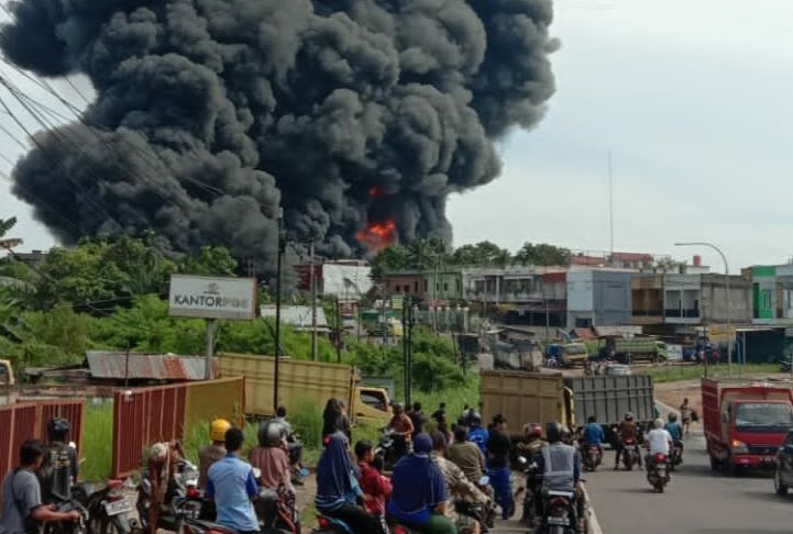 JAMBERITA.COM - Gudang minyak di Jalan Lingkar Barat, RT 71 Kelurahan Kenali Besar, Kecamatan Alam Barajo, Kota Jambi terbakar sampai dengan mengeluarkan suara ledakan. Itu terjadi sekitar pukul 09.15 WIB, Senin (15/8/2022).