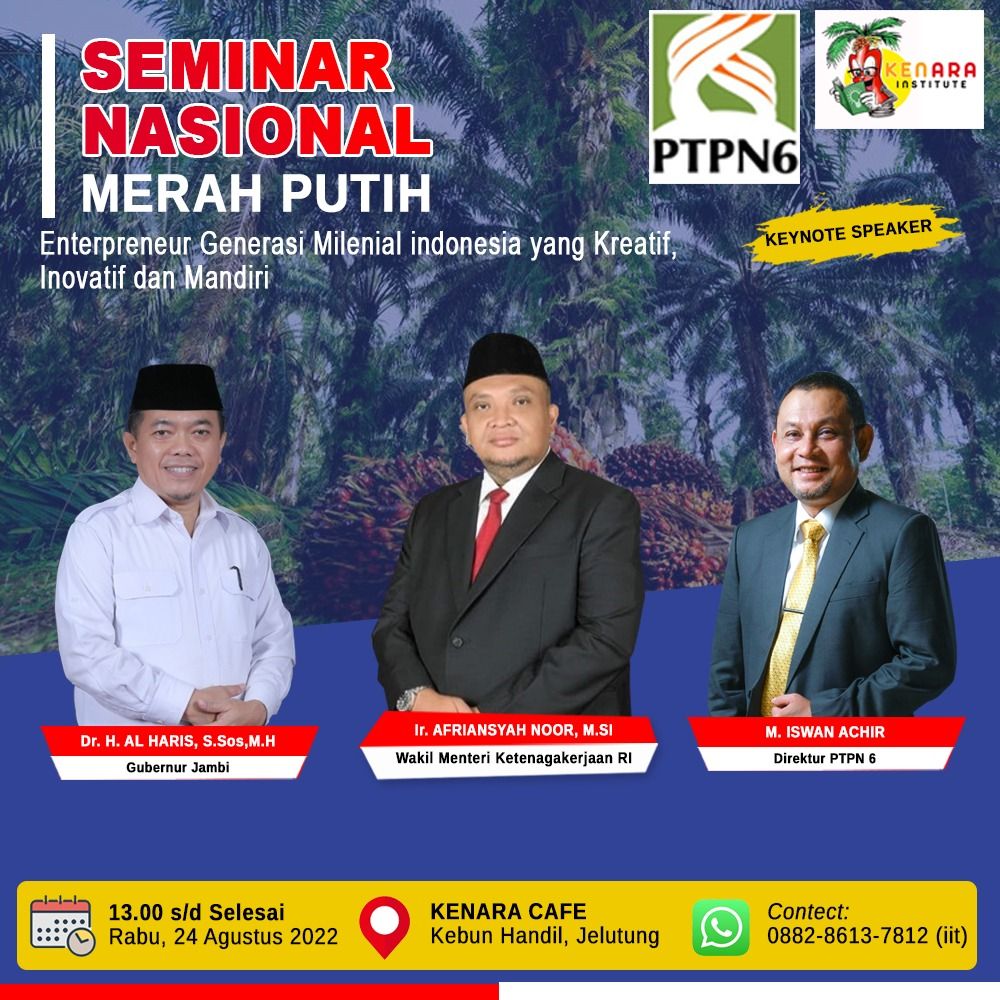 JAMBERITA.COM - Inisiasi PT. Perkebunan Nusantara 6 atau PTPN 6 Jambi untuk mewujudkan Indonesia Emas 2045, salah satunya dilakukan dengan Seminar Nasional Merah Putih, 24 Agustus 2022 di Kenara Cafe dan Resto.