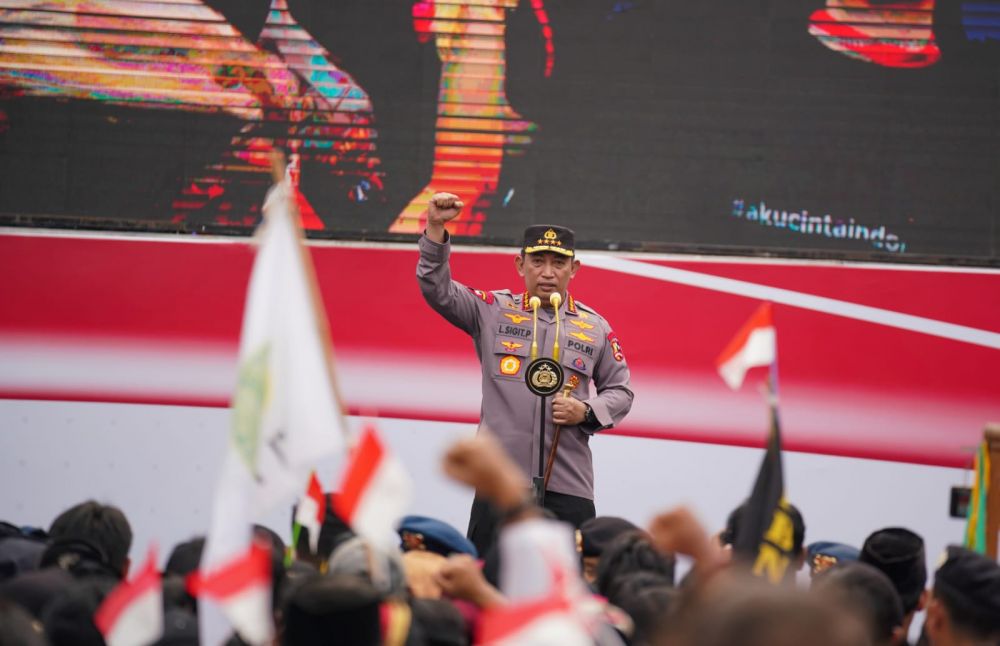 "Mari kita jaga semangat persatuan dan kesatuan. Negara Kesatuan Republik Indonesia (NKRI) adalah harga mati. Oleh karena itu semangat ini harus terus kita jaga. Kita antar Indonesia menuju visi Indonesia Emas 2045, merdeka, merdeka, merdeka," kata Sigit dalam sambutannya.