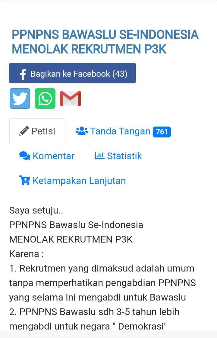 JAMBERITA.COM - Sebuah petisi online menyebar soal Staf Bawaslu se-Indonesia menolak rekrutmen Pegawai Pemerintah dengan Perjanjian Kerja (PPPK) Bawaslu. Hal ini dikarenakan berbagai macam alasan.