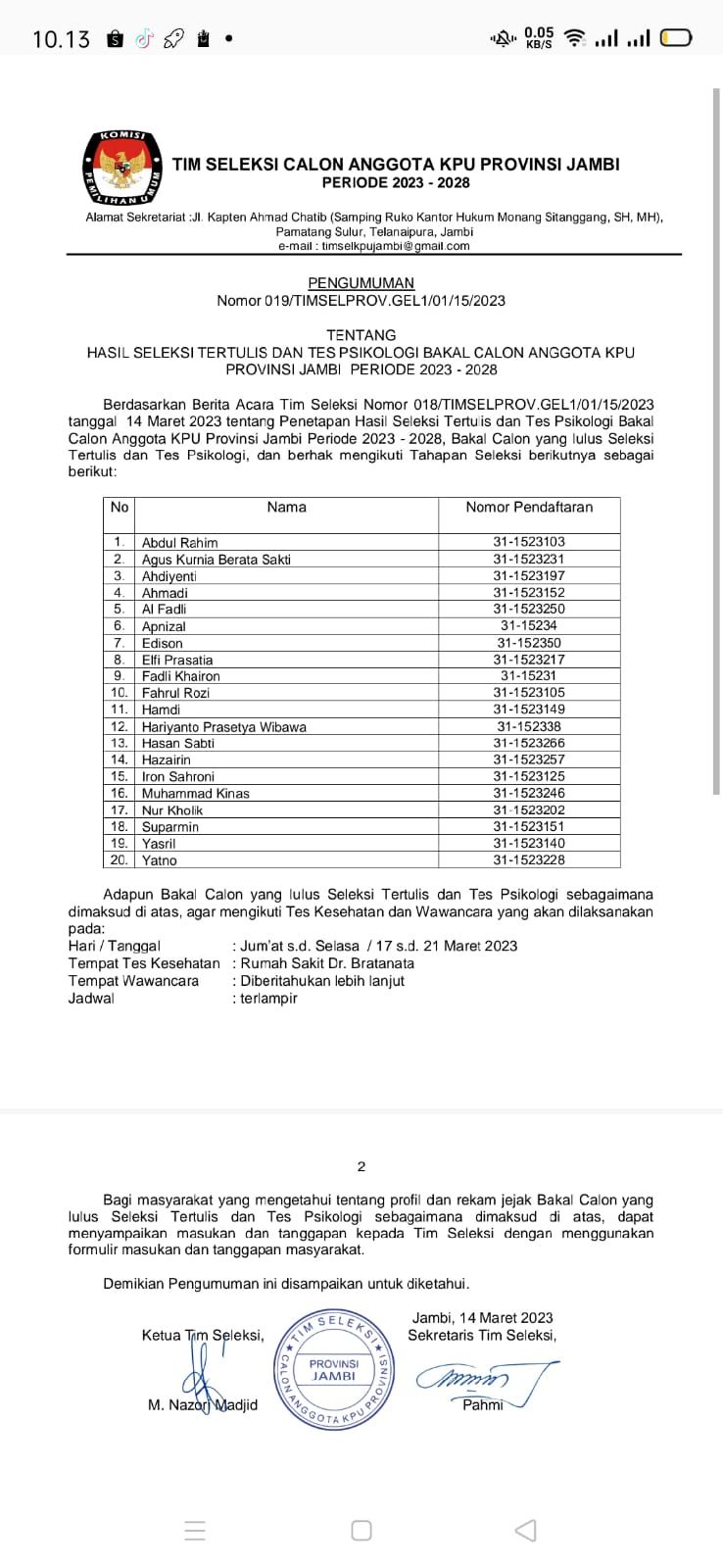 JAMBERITA.COM - Timsel KPU Provinsi Jambi sudah mengumumkan 20 besar calon Anggota KPU Provinsi Jambi periode 2023-2028, Selasa (14/3/2023). Hal ini diketahui dari pengumuman nomor 019/TIMSELPROV.GEL1/1/01/15/2023.